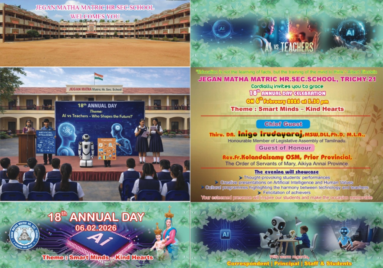 Jegan Matha Matric Higher Secondary School, Trichy, stands as a beacon of knowledge and values, dedicated to shaping young minds with wisdom, discipline, and compassion. The institution is administered by the Servite Fathers of Aikiya Annai Province of the Order of Servants of Mary and entrusted to the care of Jegan Matha Priory, ensuring that education is always blended with faith, service, and holistic growth.